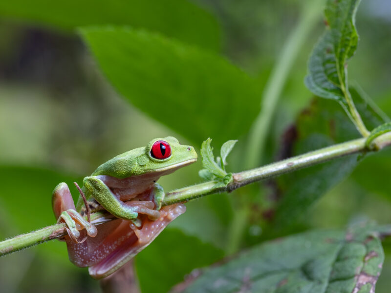 In fact, after a rain is the perfect time to go looking for frogs. In addition to the Golfo Dulce and granular poison dart frogs that are most easily found in the leaf litter along the creek banks, the semi-arboreal green-and-black poison dart frogs can best be found as they traverse the ground when moving from tree to tree. The various tree frog species tend to find a perfectly camouflaged position to lay low and sleep during the day, becoming active as the sun goes down. They can be found by homing in on their distinctive calls, aided by a headlamp once close. The photogenic red-eyed tree frog is commonly found on vegetation near the El Remanso pool – perfect for a pre-dinner shoot. At night, it is often easiest to photograph handheld with flash, freezing subject and camera motion with the quick strobe. A softbox, handheld or on a flash bracket, can be positioned just out of frame for soft, even lighting.